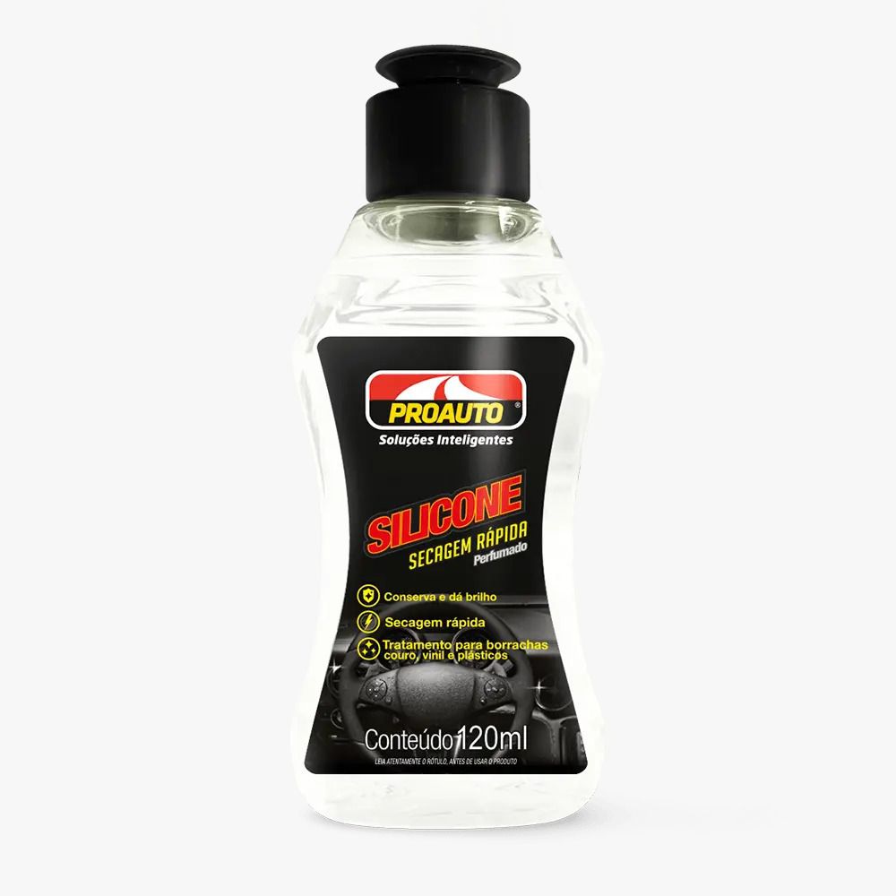 O Silicone de Secagem Rápida Proauto protege contra ressecamento e revitaliza o brilho original de superfícies plásticas, vinílicas, painel para-choque, couro e borrachas.